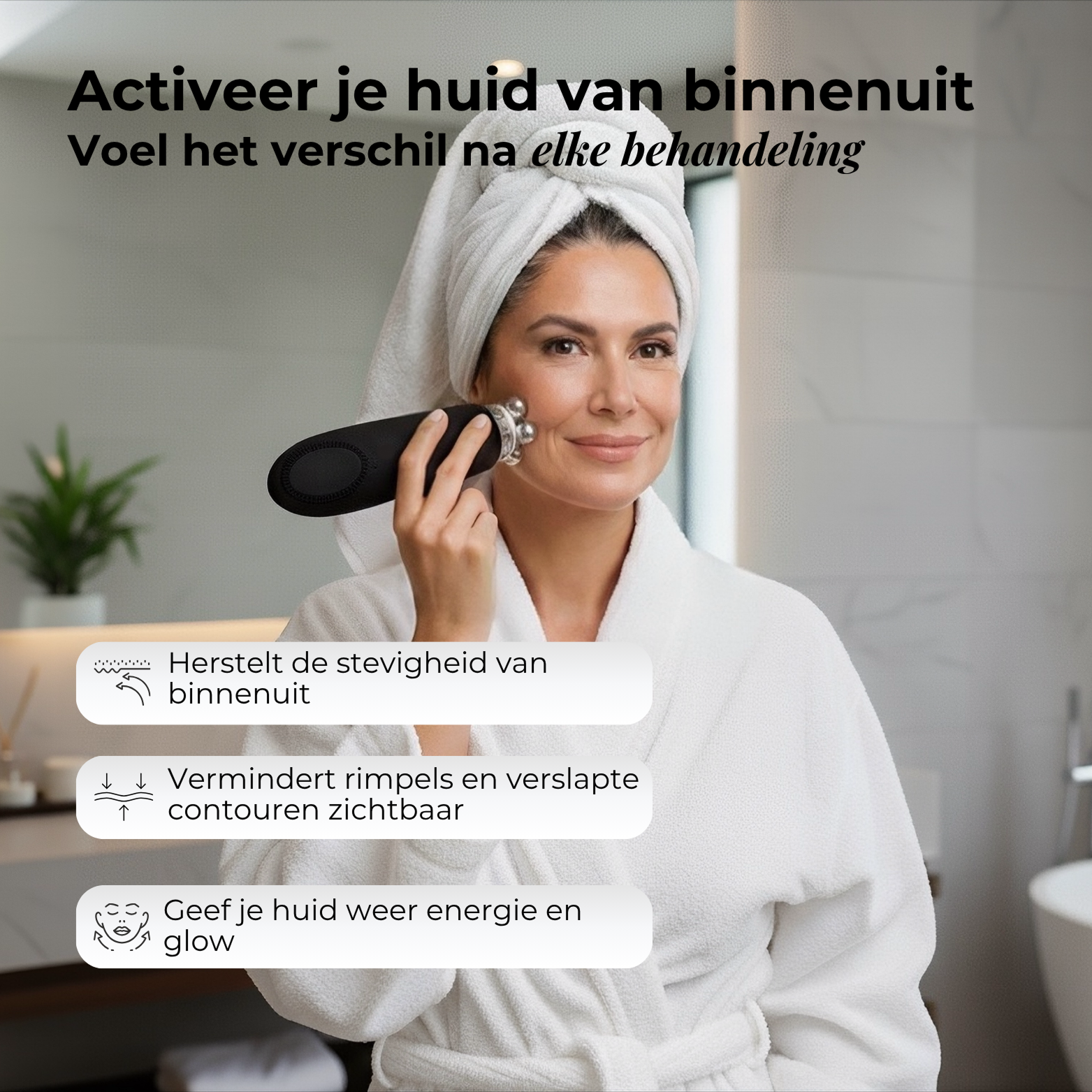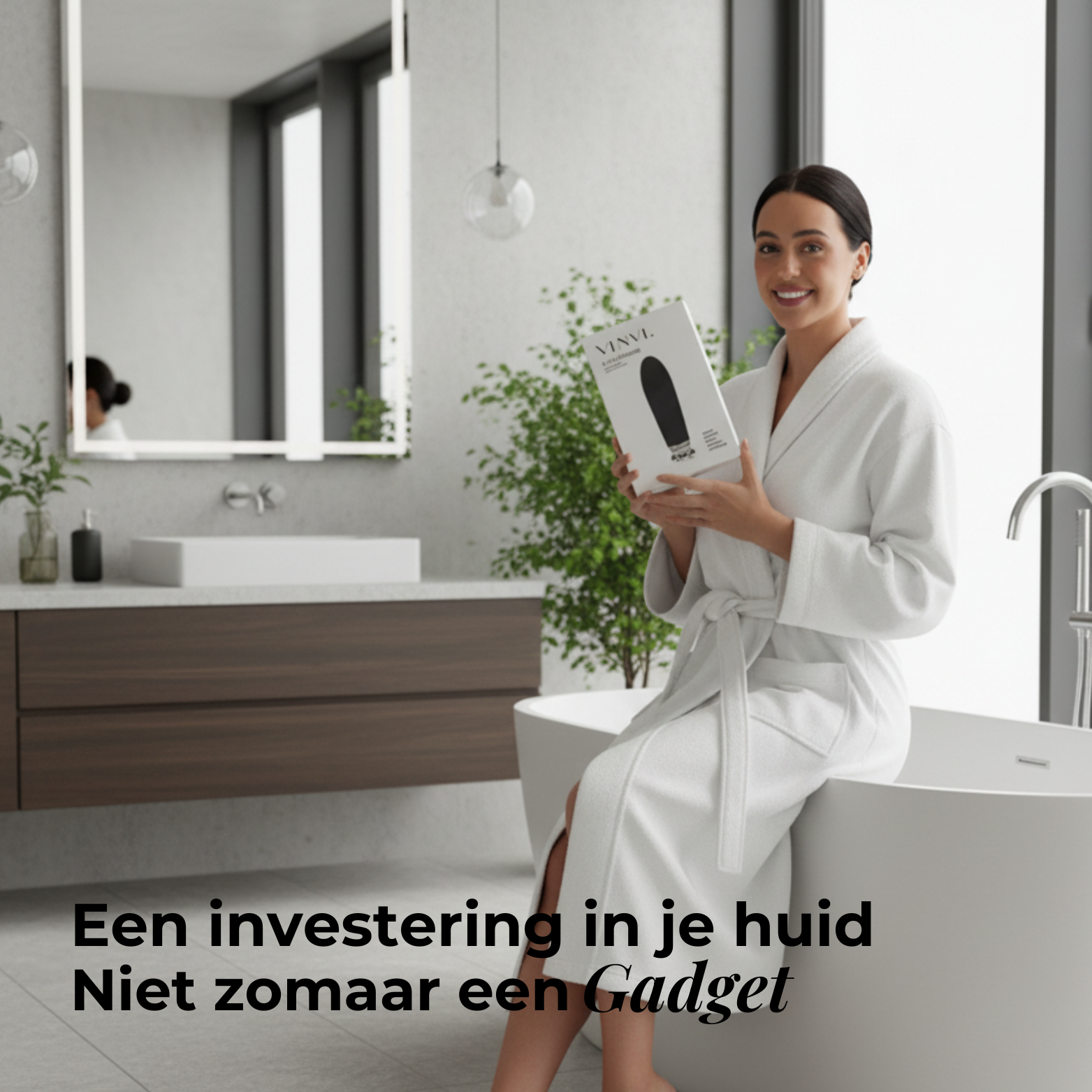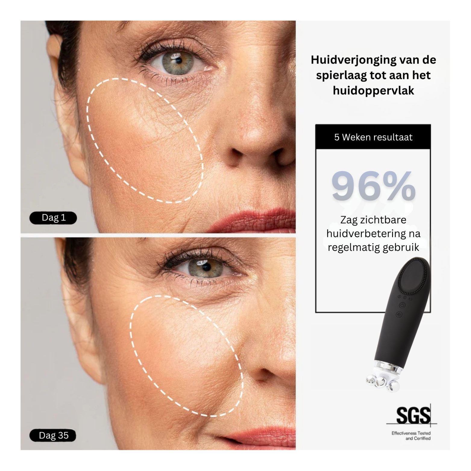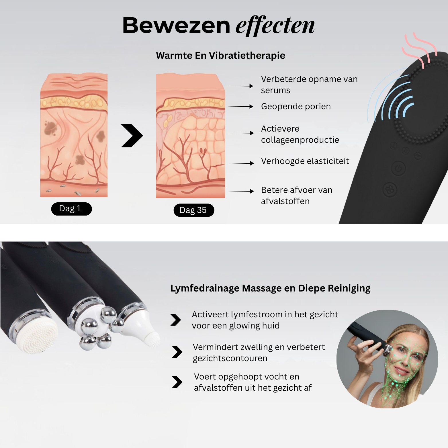 De combinatie van warmte, vibratie en lymfestimulatie is klinisch bewezen om de huidelasticiteit te verbeteren en de bloedsomloop te stimuleren.Het is precies deze technologie die we in huidinstituten gebruiken, maar dan veilig en eenvoudig voor dagelijks gebruik thuis.Je huid wordt actiever, steviger en krijgt haar natuurlijke glans terug. - Dr. E. van Laar, huidtherapeut & anti-aging specialist