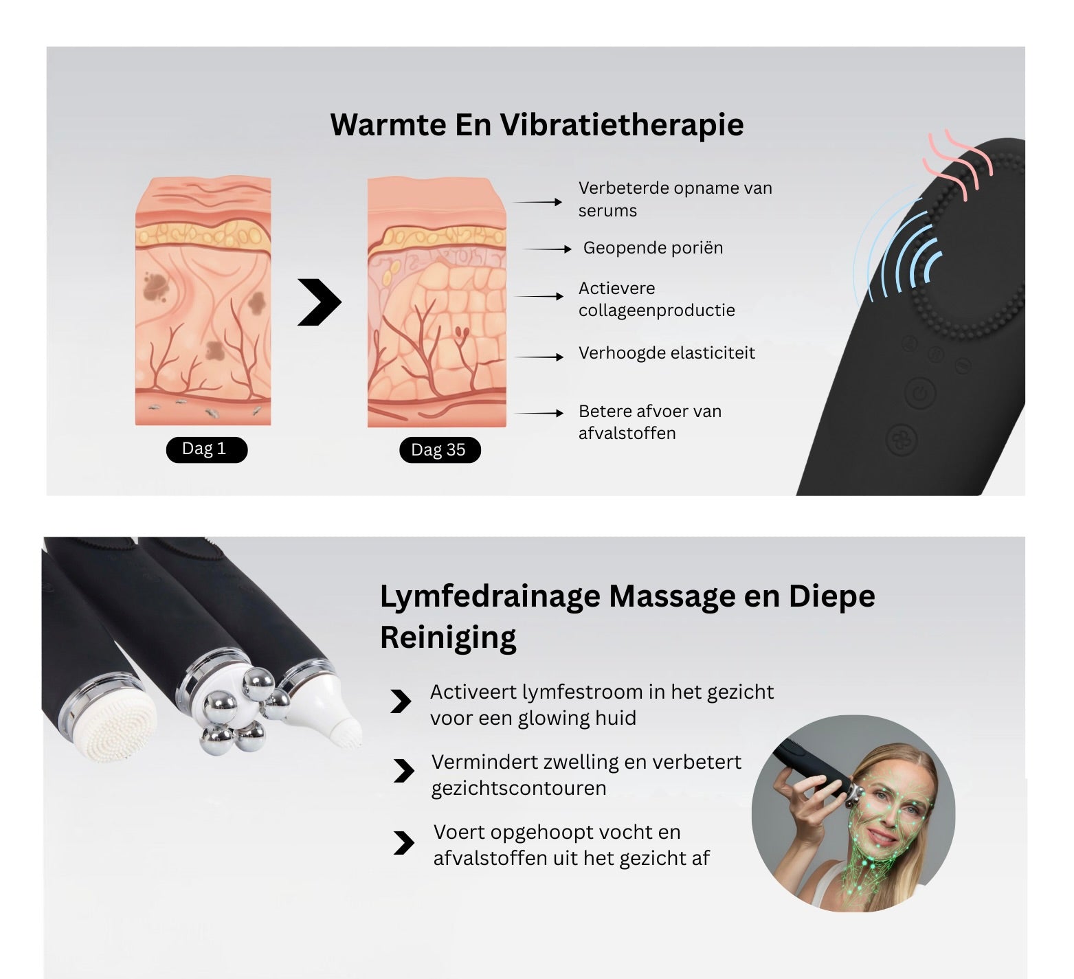 De combinatie van warmte, vibratie en lymfestimulatie is bewezen effectief om de huidelasticiteit te verbeteren en de doorbloeding te bevorderen.Het is precies deze technologie die we ook in professionele salonbehandelingen gebruiken, maar dan nu op een veilige, thuis toepasbare manier.